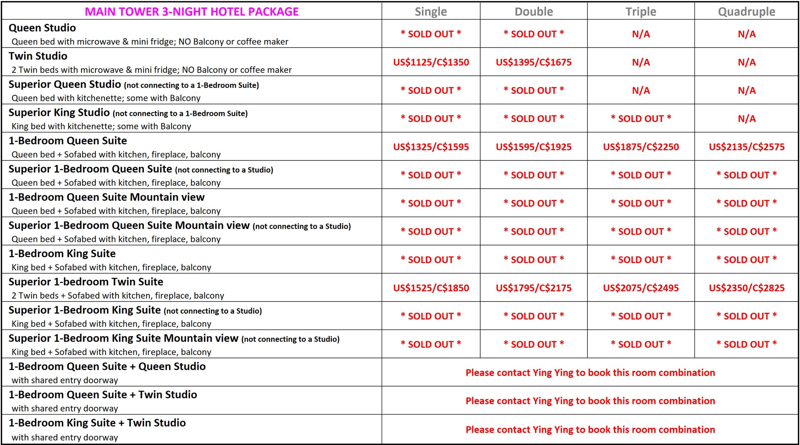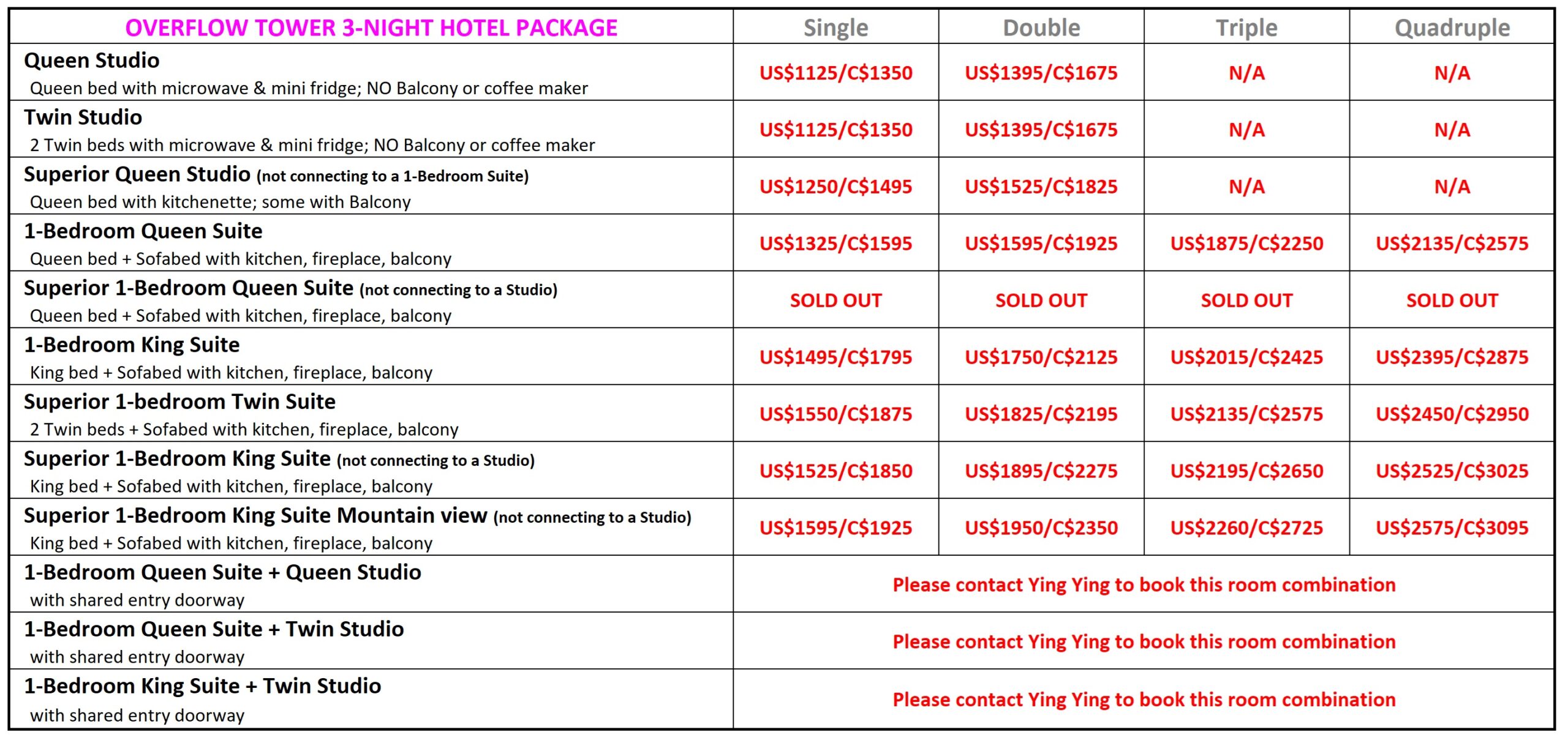 The Overflow Tower has three floors of accommodation rooms and it will be our overflow accommodation once we sell out the Main Tower. 2-night Hotel Packages are in the Overflow Tower and they are on sale October 1, 2026 .