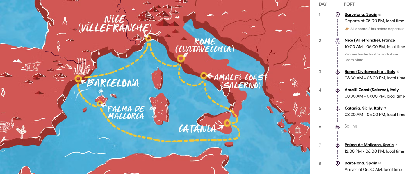 - Barcelona, Spain to Nice (Villefranche), France to Rome (Civitavecchia), Italy to Amalfi Coast (Salerno), Italy to Catania, Italy to Palma de Mallorca, Spain to Barcelona, Spain